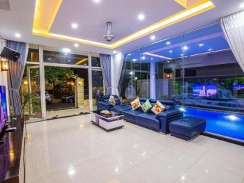 - Phòng khách rộng rãi, được trang bị tivi 65in, truyền hình internet, quạt cây, điều hòa, bàn ghế uống trà, wifi, karaoke, WC.