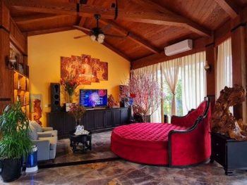 - Phòng khách rộng rãi cho cả đoàn tụ họp, quây quần, có giường tròn đỏ rộng phong cách