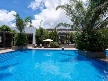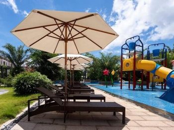Bể bơi nội khu cao cấp bốn mùa có phụ phí, khuôn viên xanh, không khí thoáng đãng thích hợp nghỉ dưỡng.